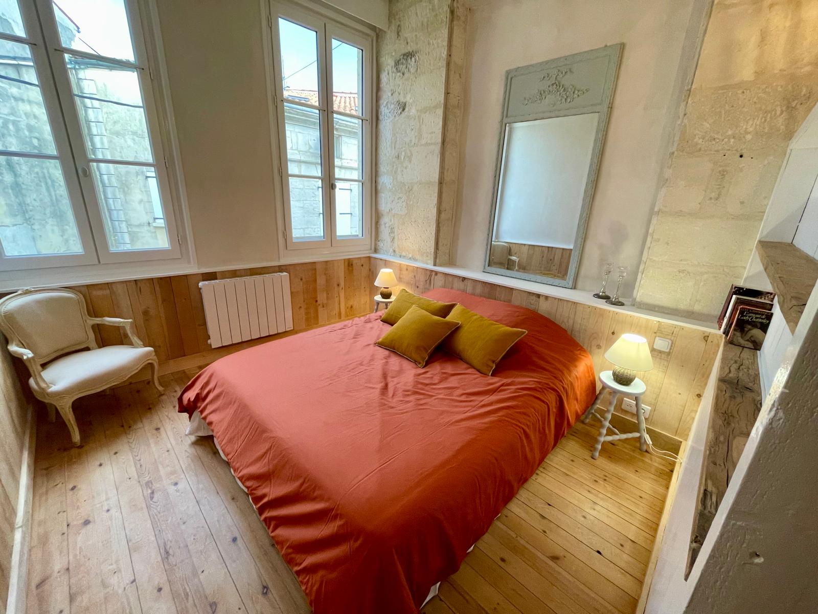 La chambre comprend un espace nuit, un coin bureau, une salle d'eau sur le palier avec petit bain, douche et WC.